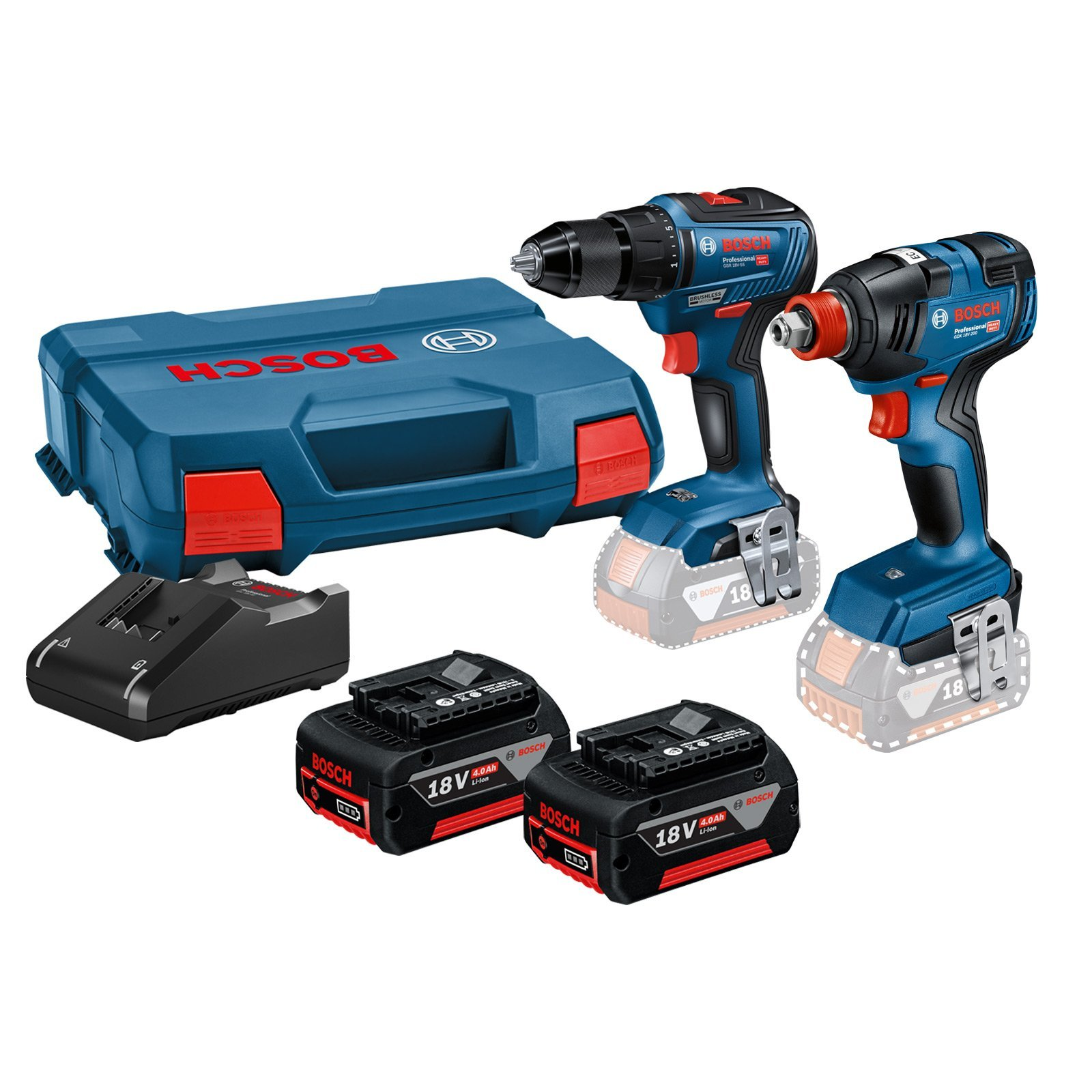 1x Bosch Akku-Drehschlagschrauber GDR 18V-200 1x Bosch Akku-Bohrschrauber GSR 18V-55 2x Bosch Akku GBA 18V 4,0 Ah 1x Bosch Schnellladegerät GAL 18V-40 in L-Case