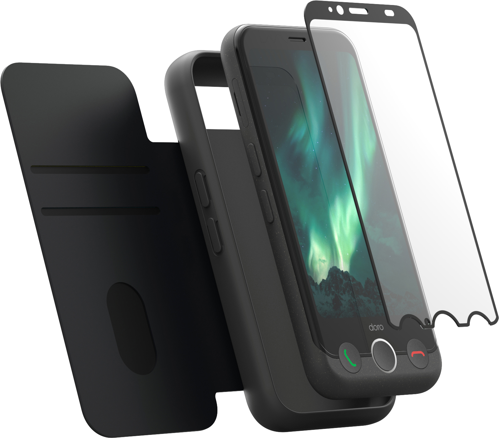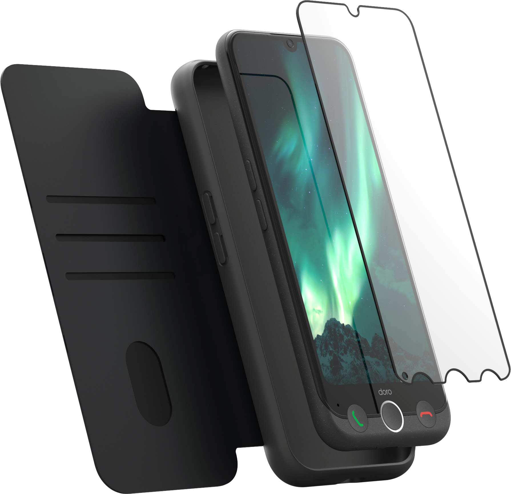 DORO Aurora A10 + Display Schutzglas und Wallet Case 64 GB Graphit Dual SIM