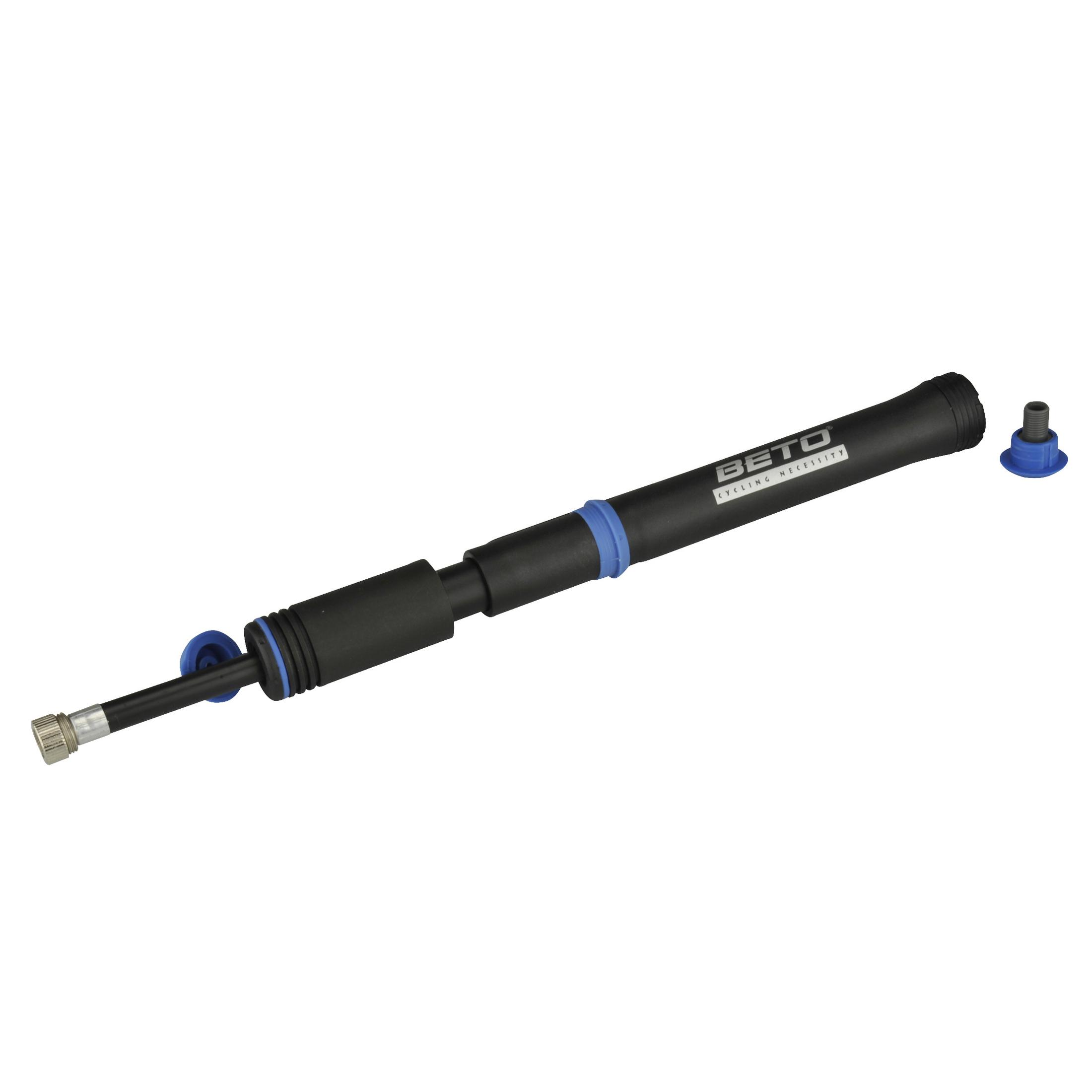 Schlauch für komfortable Bedienung, gewinde an Schlauchende zur Fixierung, durch Adapter für alle Ventile passend, Verstaufach für Adapter