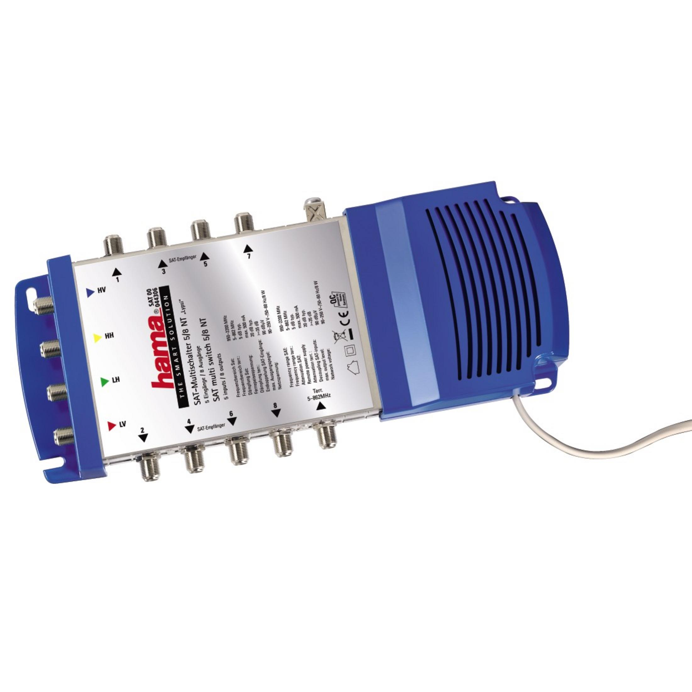 Erdungsanschluss, Entkopplung SAT-Ausgänge (min.): 35 dB, Integriertes Schaltnetzteil: 18 V/0,5 A, Leistung: 8 W, Max. Fernspeisestrom: 500 mA, Netzspannung: 90 - 250 V, Durchgangsdämpfung: 6 - 10 dB, Max. Ausgangspegel: 90 dBµV