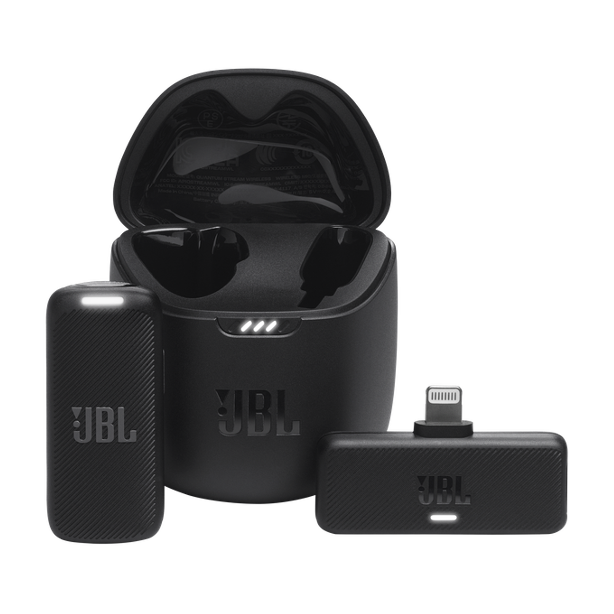 1x JBL Quantum Stream Wireless Mikrofon für USB-C-Anschluss, 1x 2,4-GHz-Empfänger, 1x Ladebox, 1x Windschutz, 1x USB-Ladekabel, 1x Warnhinweis, 1 Kurzanleitung