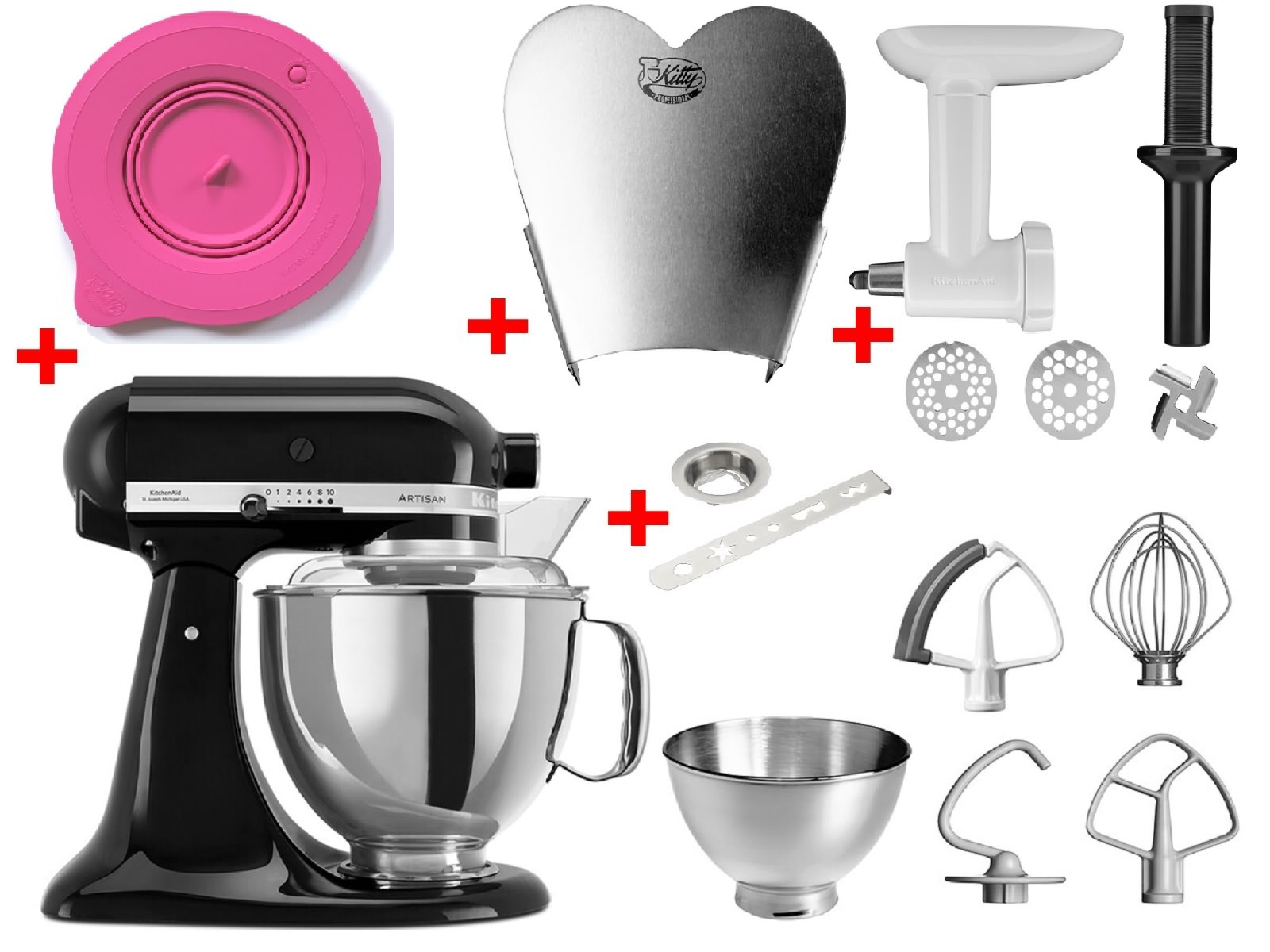 1 Küchenmaschine, 1 Profi-Frischhaltedeckel Kitty Professional, 1 Einfüllhilfe Kitty Professional, 1 Fleischwolf KitchenAid 5KSMFGA, 1 KitchenAid Spritzgebäckvorsatz 5KSMCCA, 1 Edelstahlschüssel 4.8 Liter gebürstet, 1 Edelstahl-Rührschüssel 3 Liter, 3 Edelstahlrührelmente,1 Spritzschutz Bedienungsanleitung