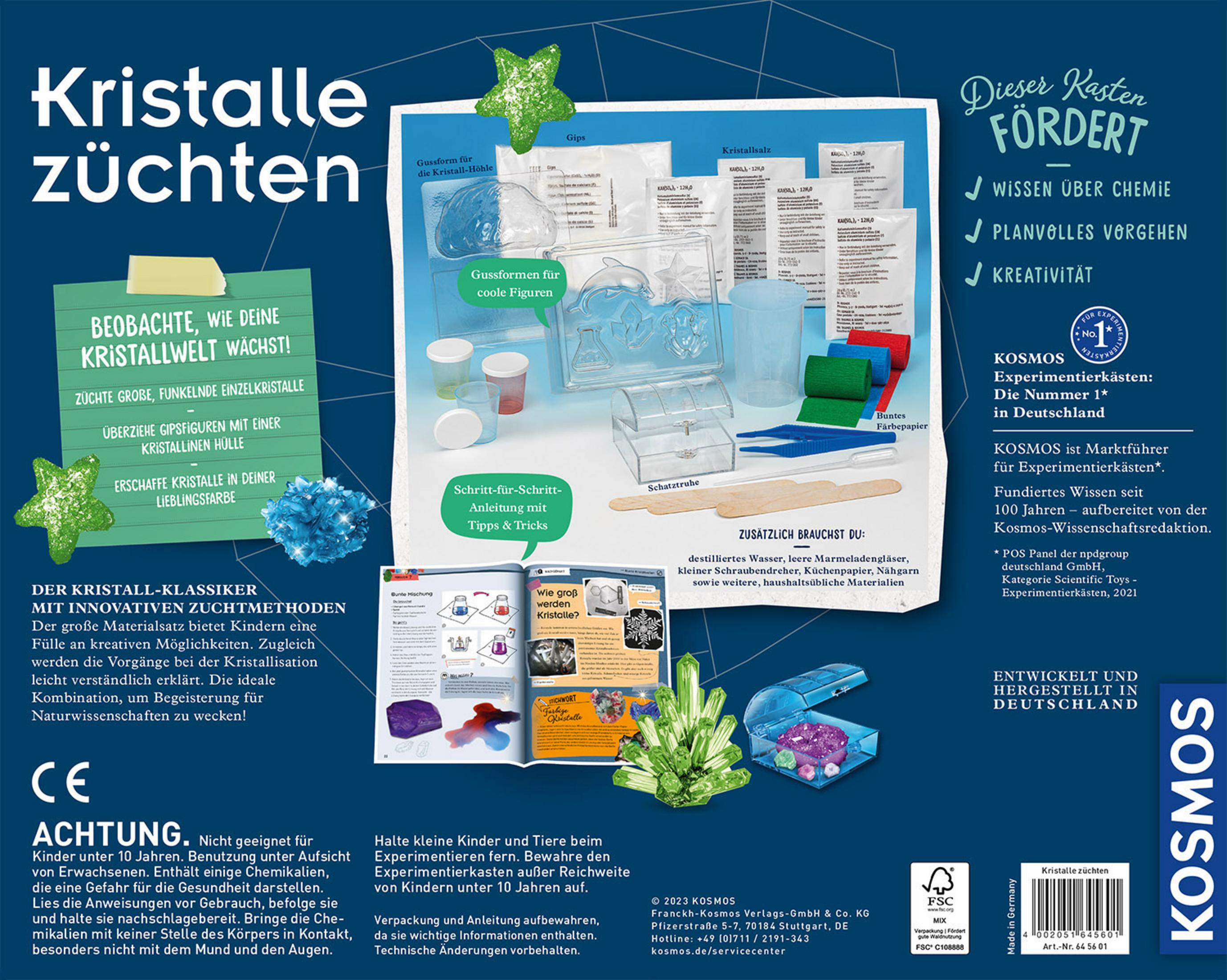 2 x 50g und 3 x 20g Abfüllungen Kaliumaluminiumsulfat (Alaun) (EG-Nr. 233-141-3); Abfüllung Gips 200 g, (EG-Nr. 231-900-3); Färbepapier (rot, blau, grün); Pinzette; Pipette; Spatel; großer Messbecher mit Deckel; 3 kleine Messbecher (rot, blau, gelb) mit Deckeln; Kristalldrusenform; Kristallfigurenform; Schatztruhe; farbig illustrierte Anleitung