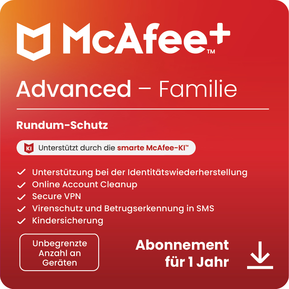 McAfee+ Advanced Familie, Antivirus und Internet-Sicherheitssoftware für eine unbegrenzte Anzahl an Geräten, 1-Jahres-Abo - [Multiplattform]