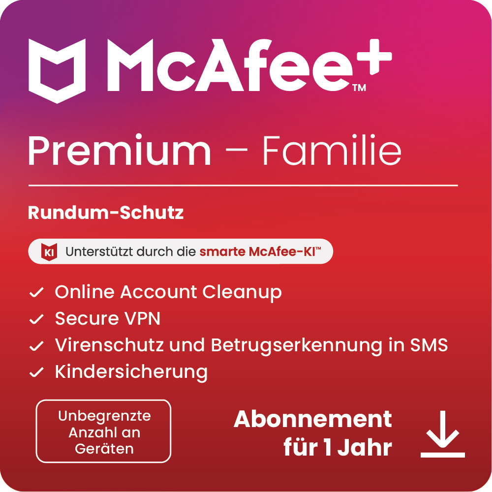 McAfee+ Premium Familie, Antivirus und Internet-Sicherheitssoftware für unbegrenzte Anzahl an Geräten, 1-Jahres-Abo - [Multiplattform]