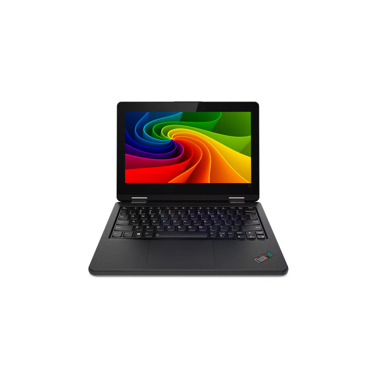 Regenbogenfarbenes Bandlogo auf grauem Quadrat mit abgerundeten Ecken, vor schwarzem Hintergrund.