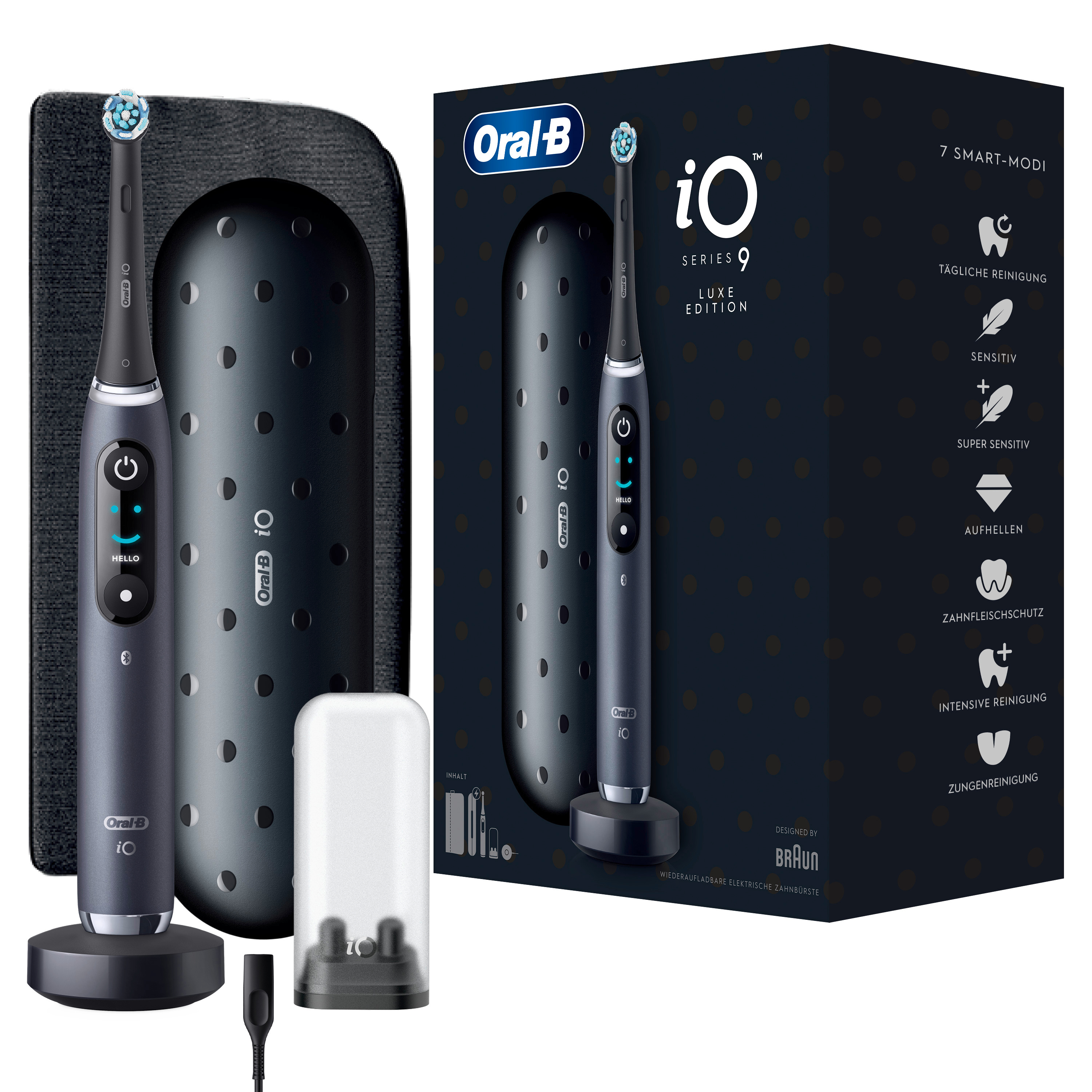 1x Handstück, 1x Aufsteckbürste, 1x Lade-Reiseetui, 1x Ladestation, 1x Mini-Etui für Aufsteckbürsten