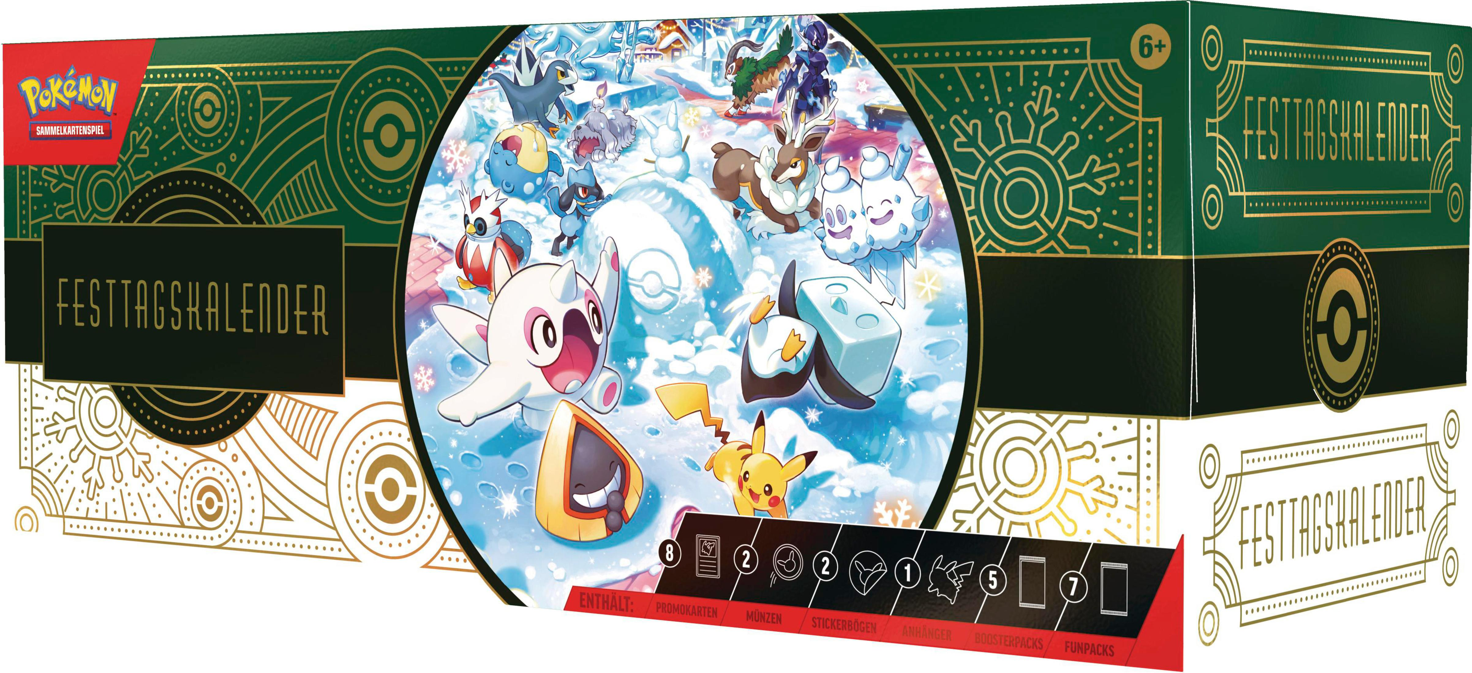 8 holografische Pokémon-Sammelkartenspiel-Karten mit einem festlichen Stempel, 5 Boosterpacks des Pokémon-Sammelkartenspiels, 7 Funpacks mit je 3 Karten des Pokémon-Sammelkartenspiels, 2 Pokémon-Münzen, 2 Pokémon-Stickerbögen, 1 Kumpel-Anhänger mit Baojian, Außerdem gibt es 1 Code-Karte für Pokémon-Sammelkartenspiel-Live!