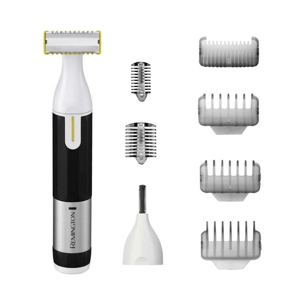 1x Multigroomer, 4x Feste Kämme, 1x Körperhaartrimmer, 1x Stoppelkamm, 1x Nasen- und Ohrenhaartrimmer