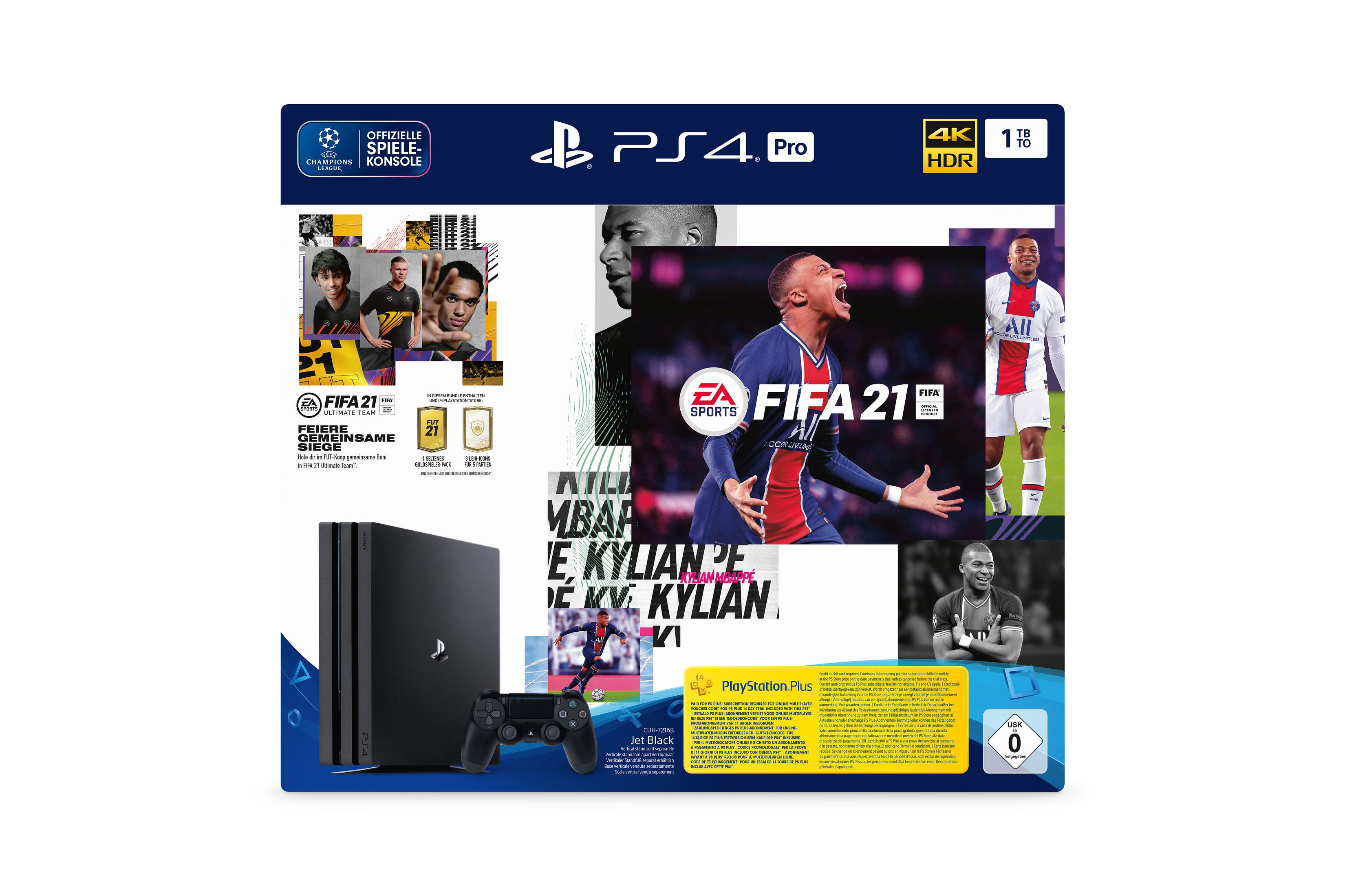 PlayStation®4 PRO Konsole, DUALSHOCK®4 Wireless-Controller, EA SPORTS™ FIFA 20 auf Blu-ray Disc, PlayStation™Store Gutschein-Code für Bonusinhalte und PlayStation Plus Testversion, HDMI-Kabel, USB-Kabel, Netzkabel