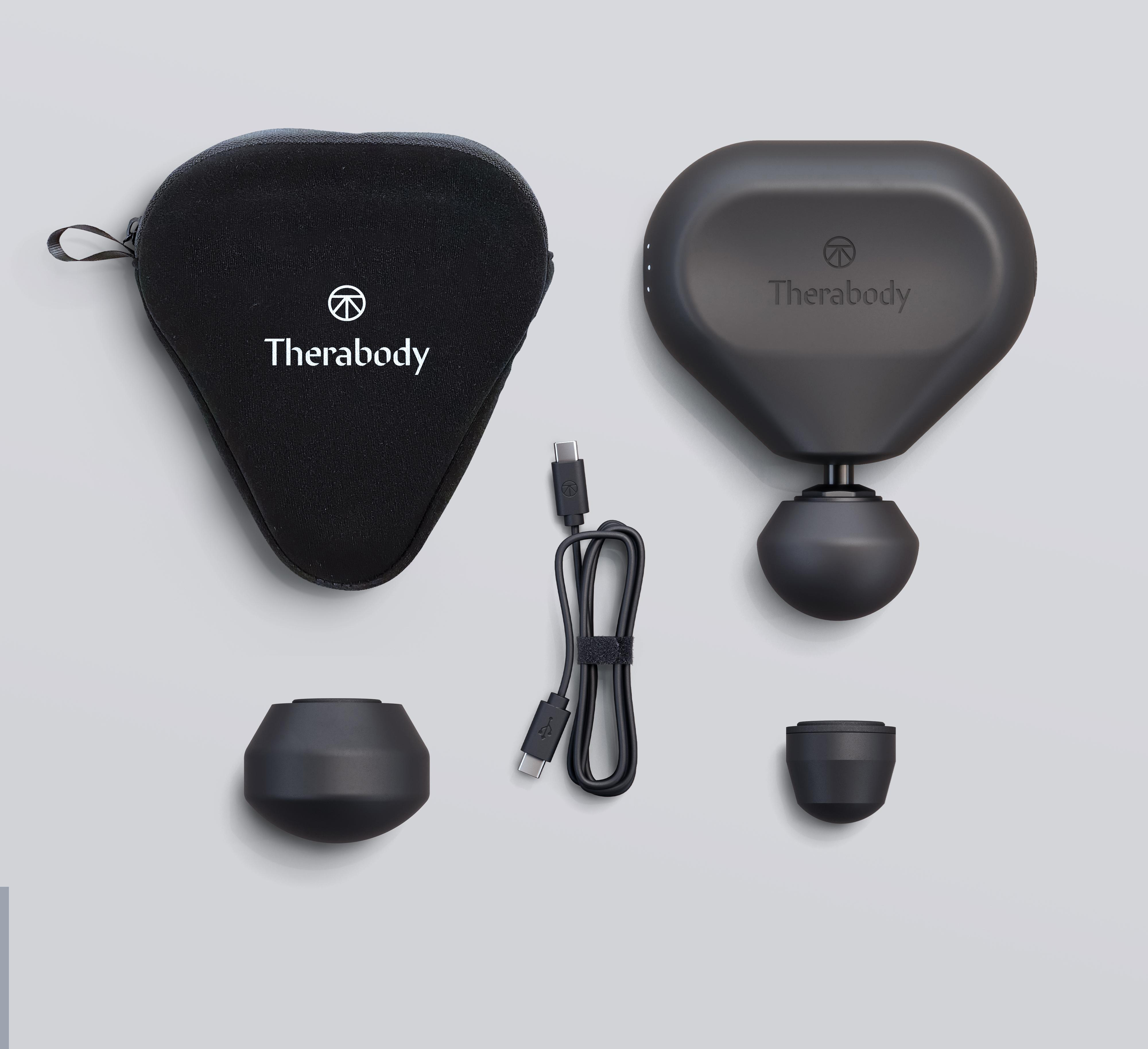 Theragun Mini Gen 3. Gerät, 3 Aufsätze, USB-C-Ladekabel, Soft-Transportetui, Bedienungsanleitung.