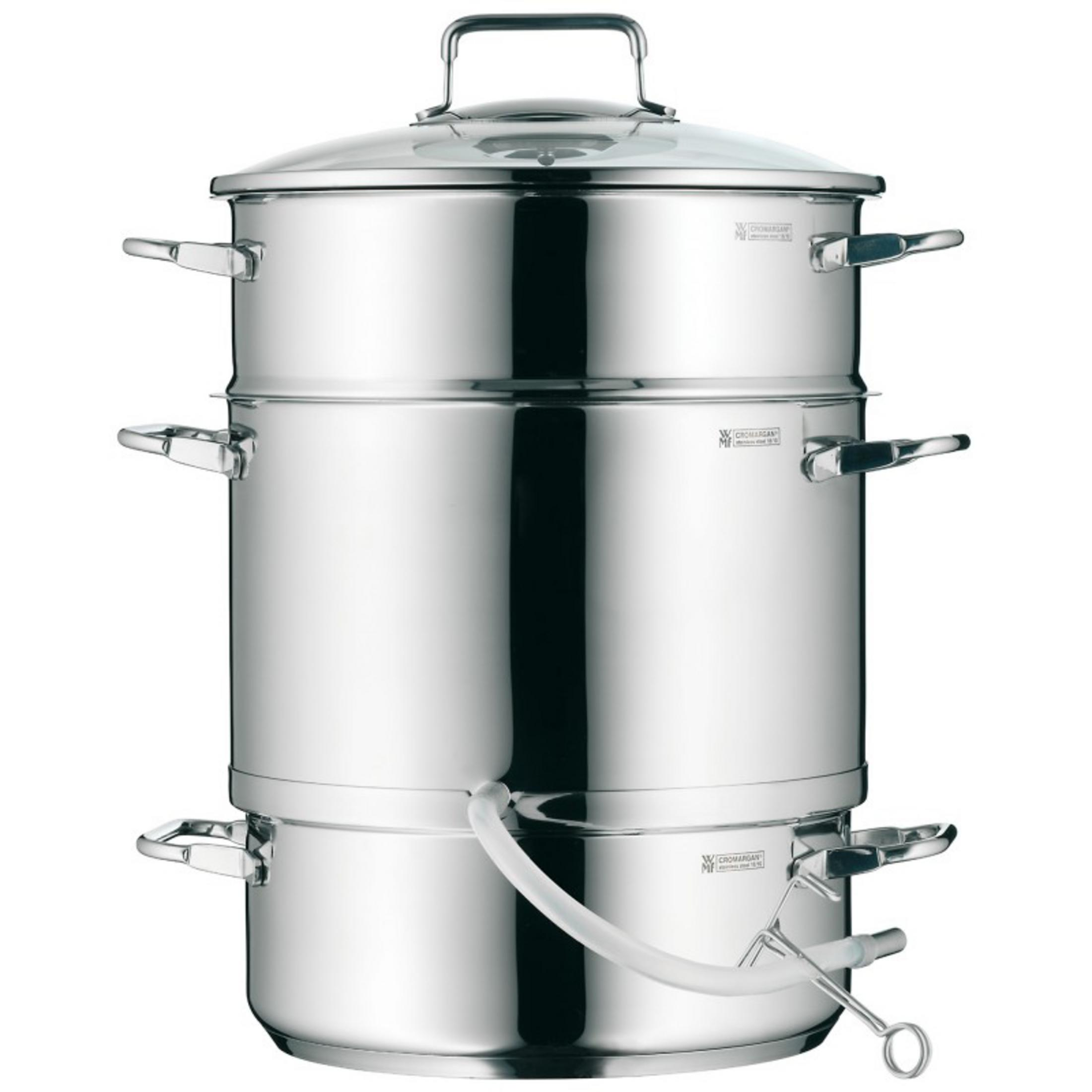 1x Güteglasdeckel, 1x Fruchtkorb, 1x Saftkorb, 1x Topfunterteil 26 cm, 1x Silikonschlauch mit Edelstahlklemme