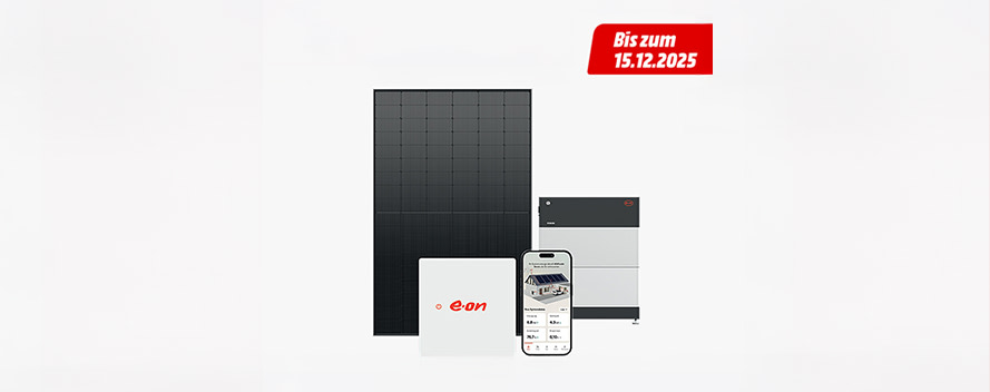 *Die Aktion gilt nur bei Beauftragung einer privaten Solaranlage von mind. 7 kWp bis 30 kWp mit einem 5 kWh Batteriespeicher und dem E.ON Home Energiemanager bei einer 100 % E.ON Tochtergesellschaft im Aktionszeitraum vom 01.10. bis 15.12.2025 und nur solange der Vorrat reicht. Die Aktion gilt nur für Kunden, die in einem teilnehmenden MediaMarkt oder Saturn Markt in Deutschland den Solar Fragebogen am Werbestand oder über einen QR-Code aus einem entsprechenden Werbemittel (z.B. Flyer) bzw. online auf der Homepage von MediaMarkt oder Saturn unter [https://www.mediamarkt.de/], bzw. [https://www.saturn.de/] ausfüllen. Das Angebot gilt ausschließlich für Privatkunden mit Wohnsitz in Deutschland und ist , außer mit dem Bestandskundenrabatt, nicht mit anderen Aktionen oder Rabatten kombinierbar. Der Wert von 15 Gratismodulen beträgt 1.500 € und der Rabatt wird in der Schlussrechnung entsprechend ausgewiesen. Eine Barauszahlung ist ausgeschlossen. Solarprodukte werden ausschließlich von den E.ON Tochtergesellschaften vertrieben (HSL Solar GmbH, Im Gewerbegebiet 12, 63881 Wiesen; Der Solarbauer Borowski GmbH, Heinz-Bäcker-Str. 38, 45356 Essen; Mehr Ampere GmbH, Am Kuffholz 2, 93138 Lappersdorf; Klarsolar GmbH, Frieda-Fromm-Reichmann-Str. 2–4, 69126 Heidelberg; GT-Solar-GmbH, Nikolaus-Otto-Str. 18, 33335 Gütersloh). Anbieter und Vertragspartner für die Nutzung und die Services des E.ON Home Energiemanagers ist die E.ON Energie Deutschland GmbH, Arnulfstr. 203, 80634 München.