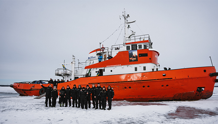 Unter Extrembedingungen: Das brandneue Samsung Galaxy S26. Person in Winterkleidung sitzt auf Boot im Polarmeer mit Galaxy S26 in den Händen.